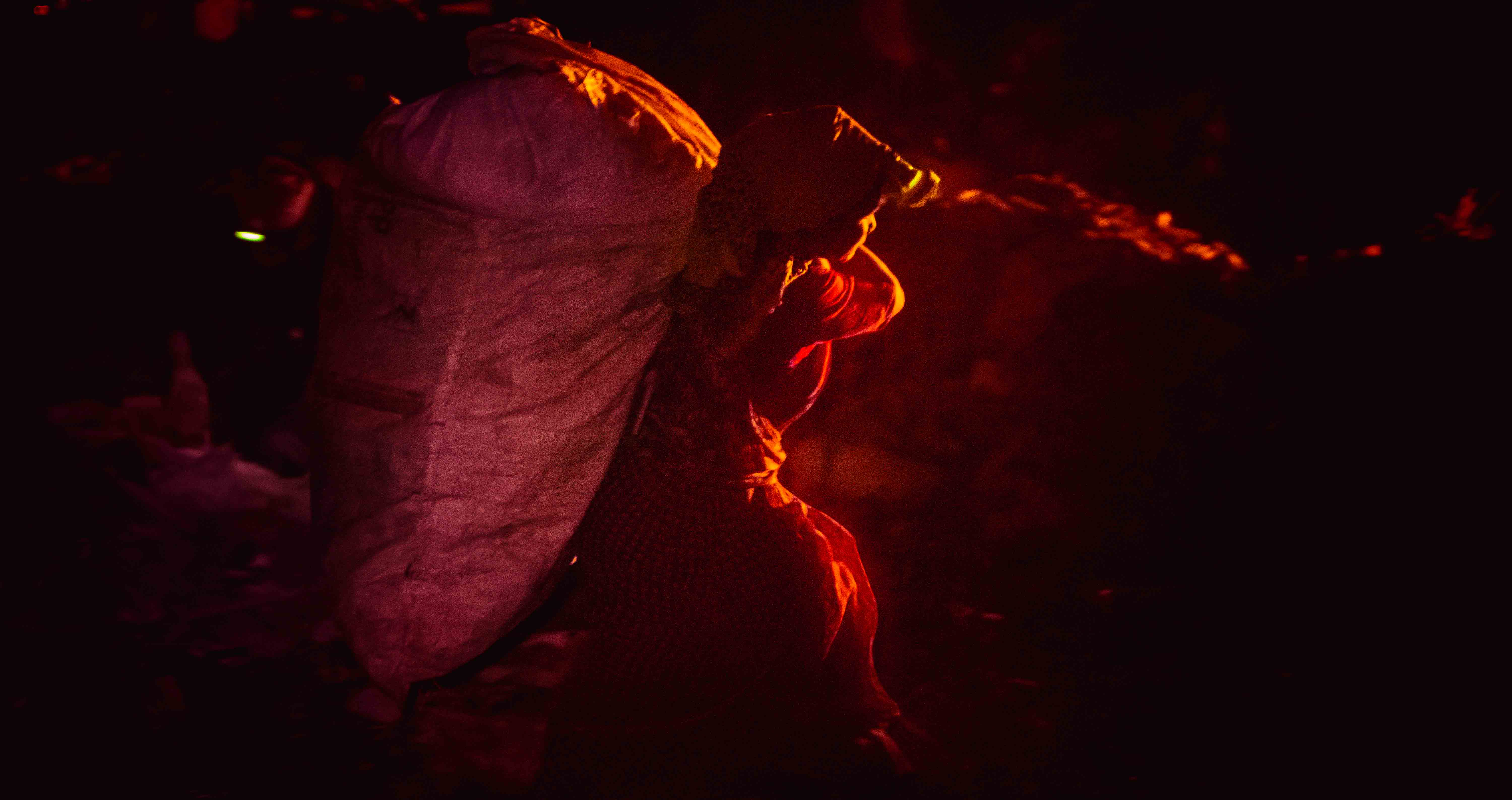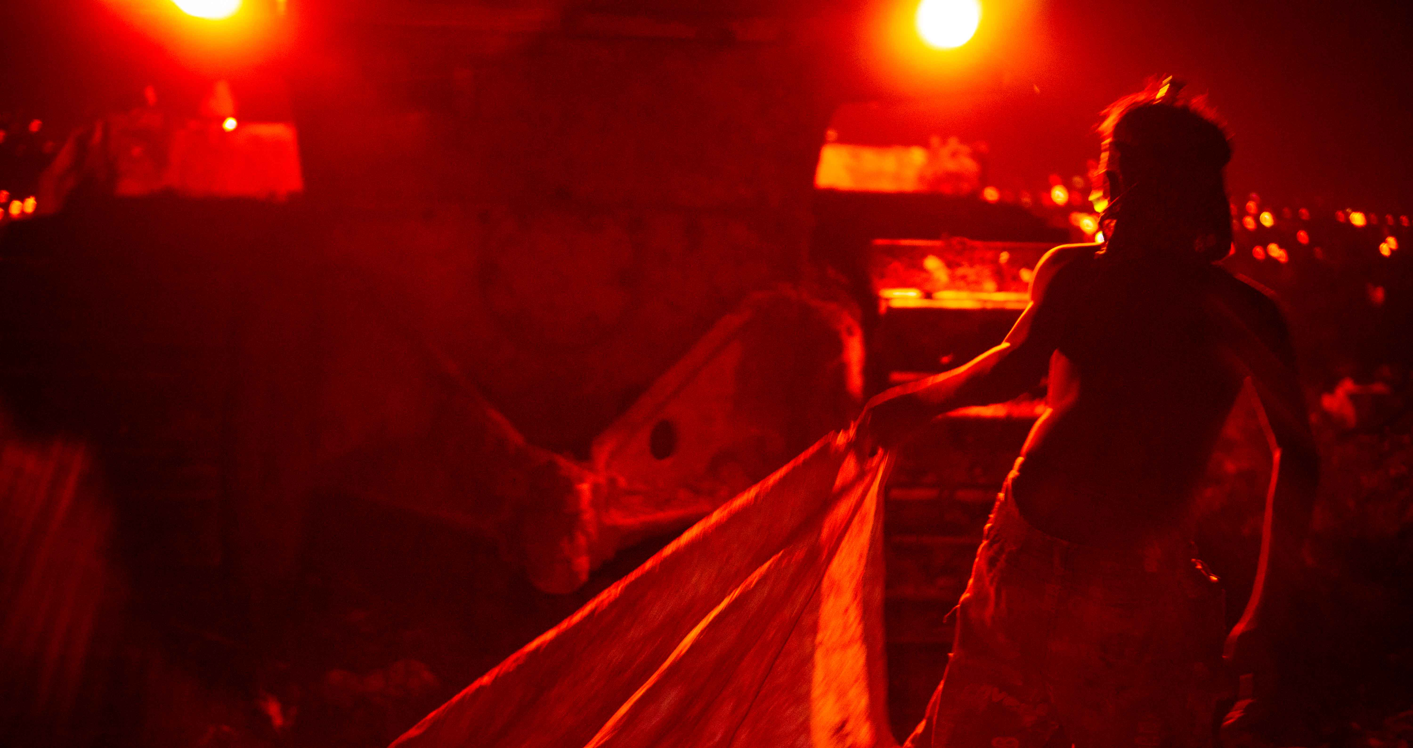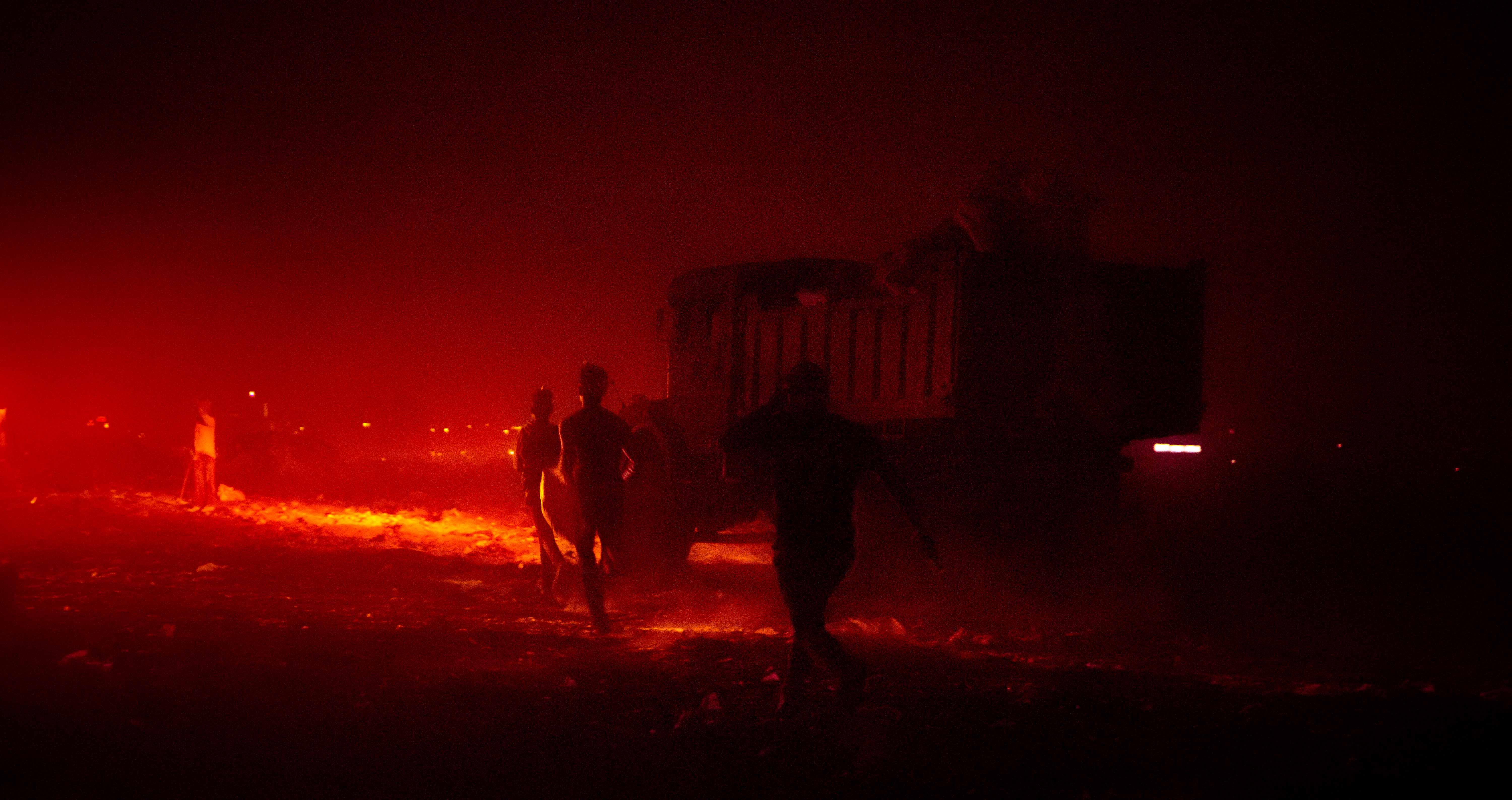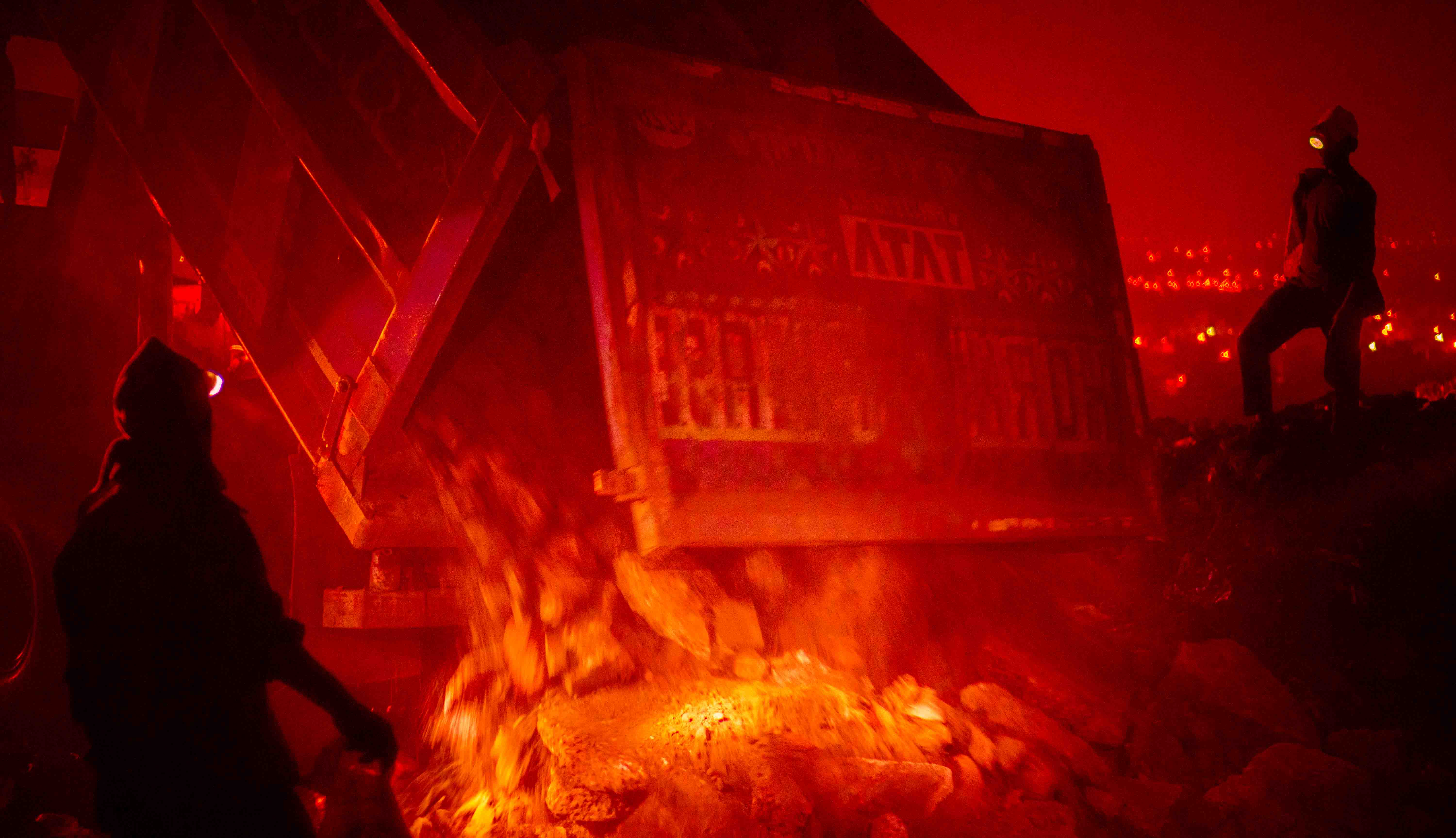 Under red lights and thick smoke, life continues. Boys, women, children. All of them climb the mountain, risking everything for scraps.