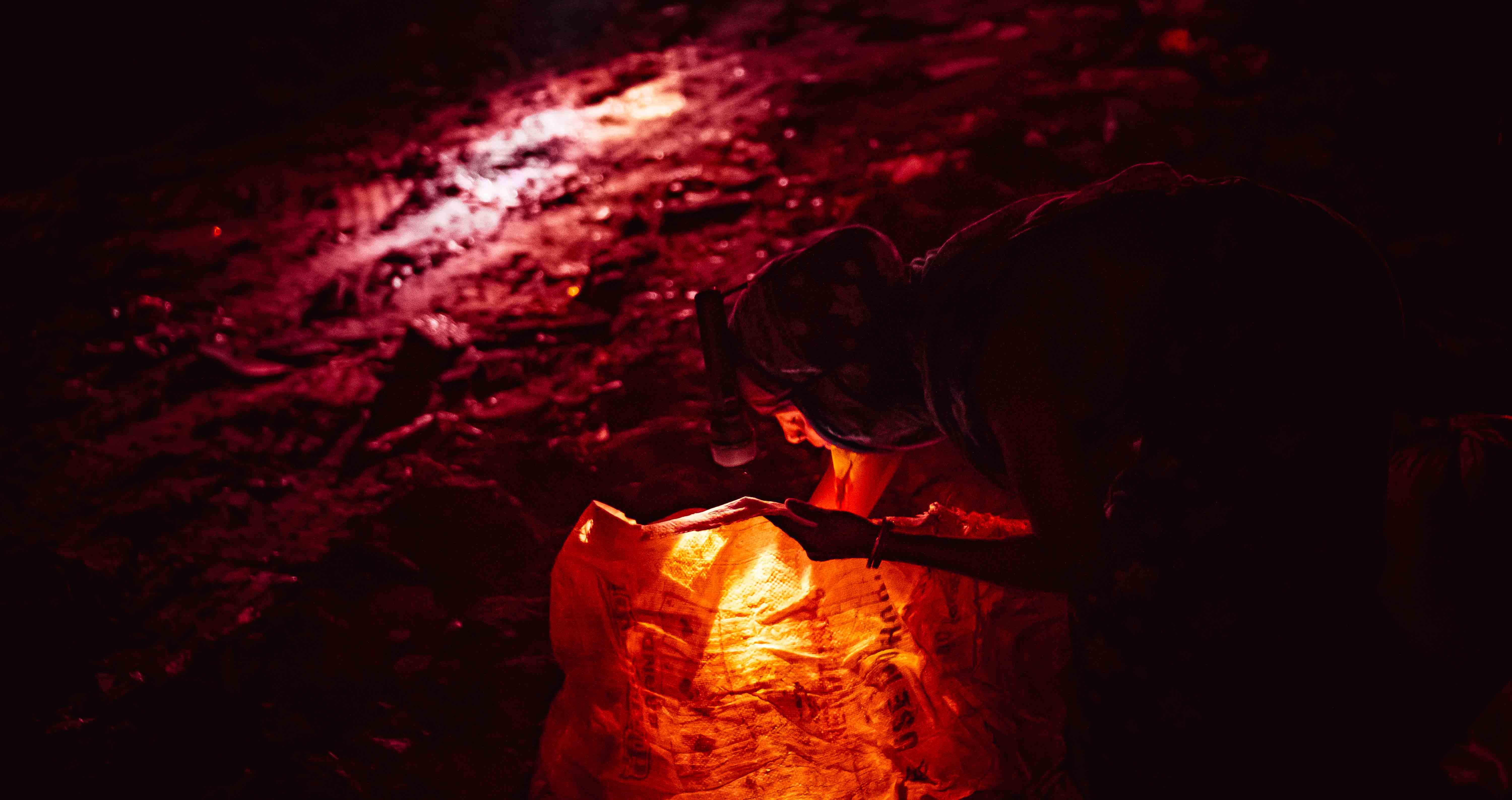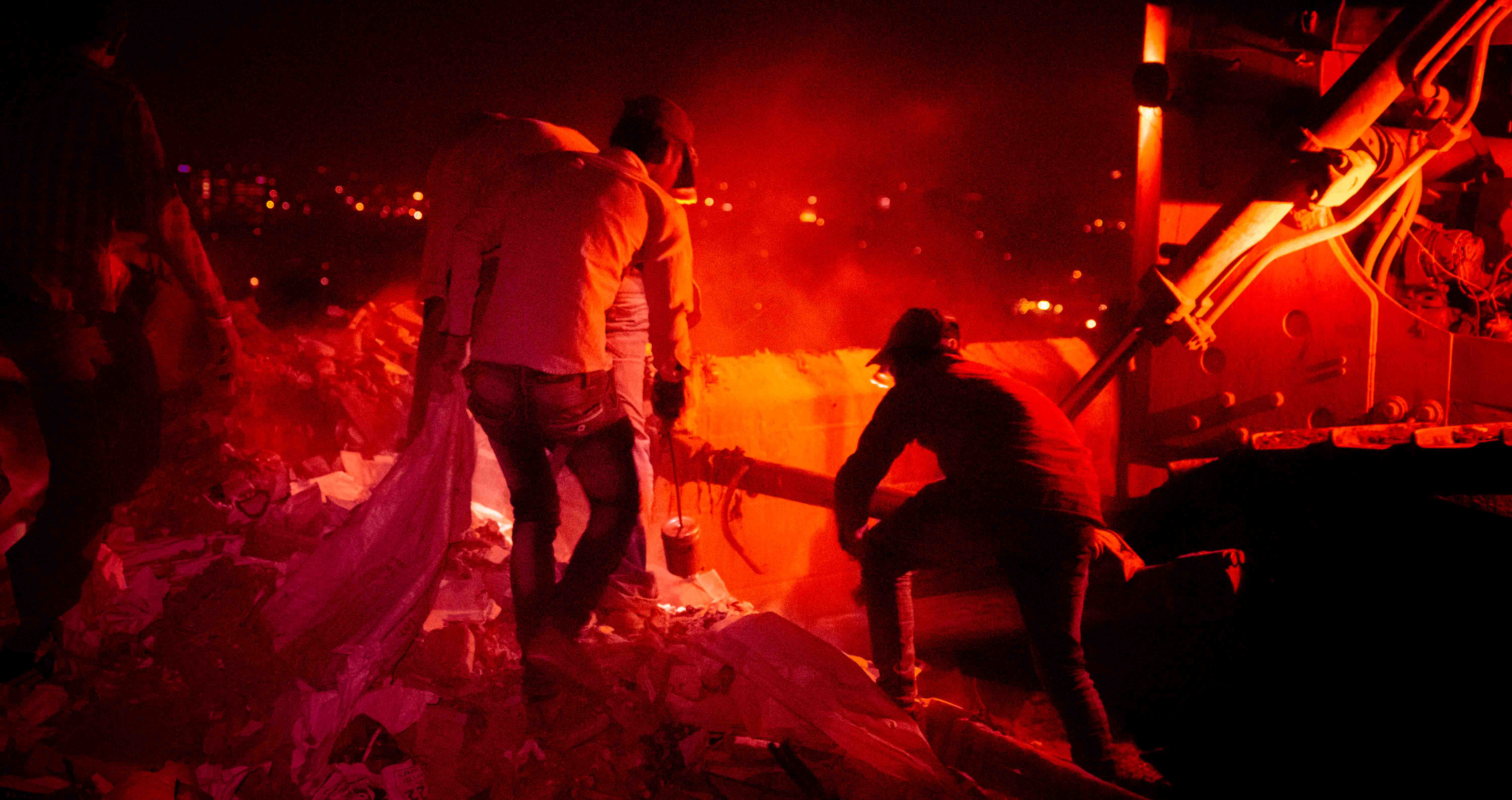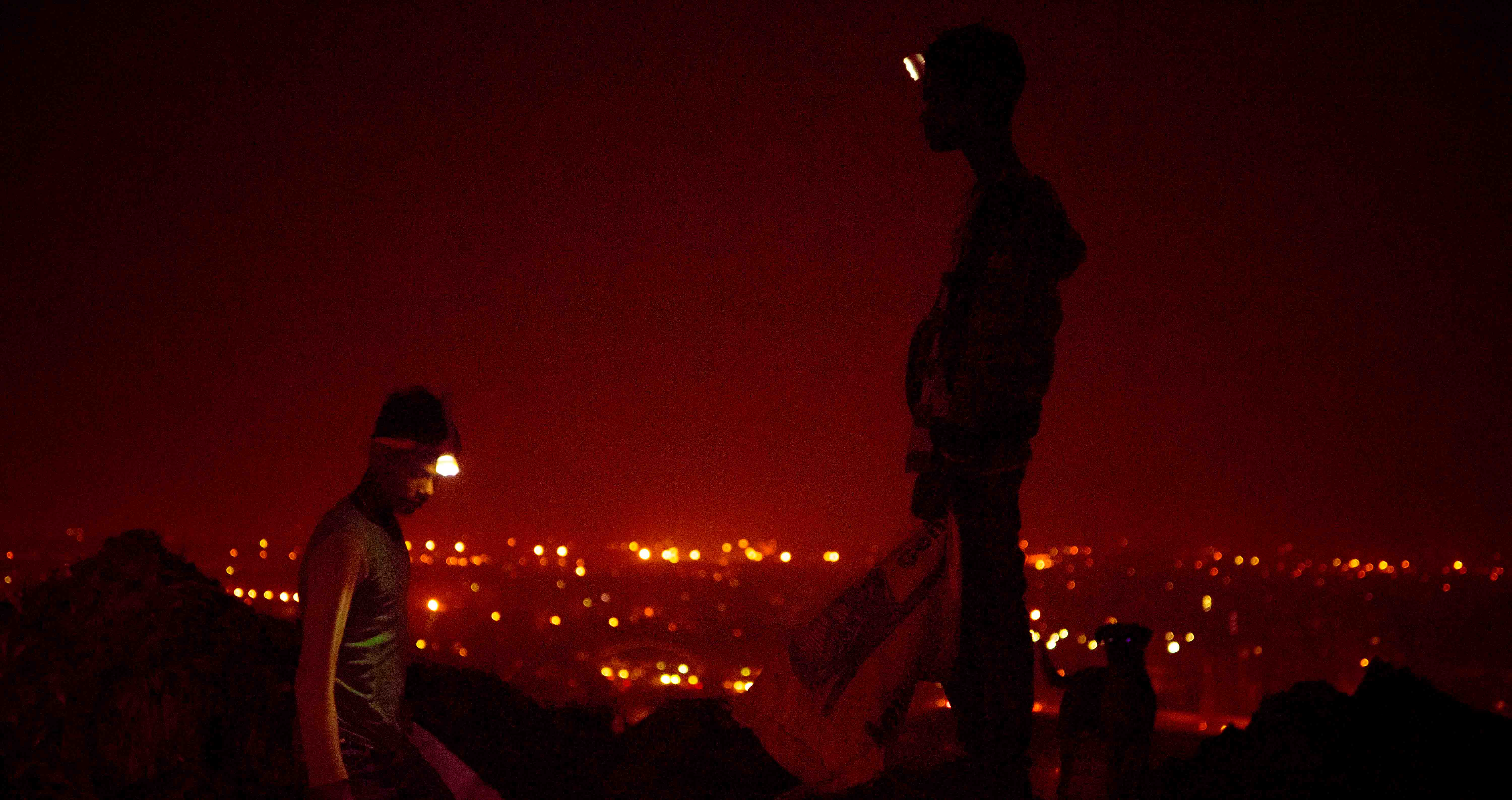 Under red lights and thick smoke, life continues. Boys, women, children. All of them climb the mountain, risking everything for scraps.