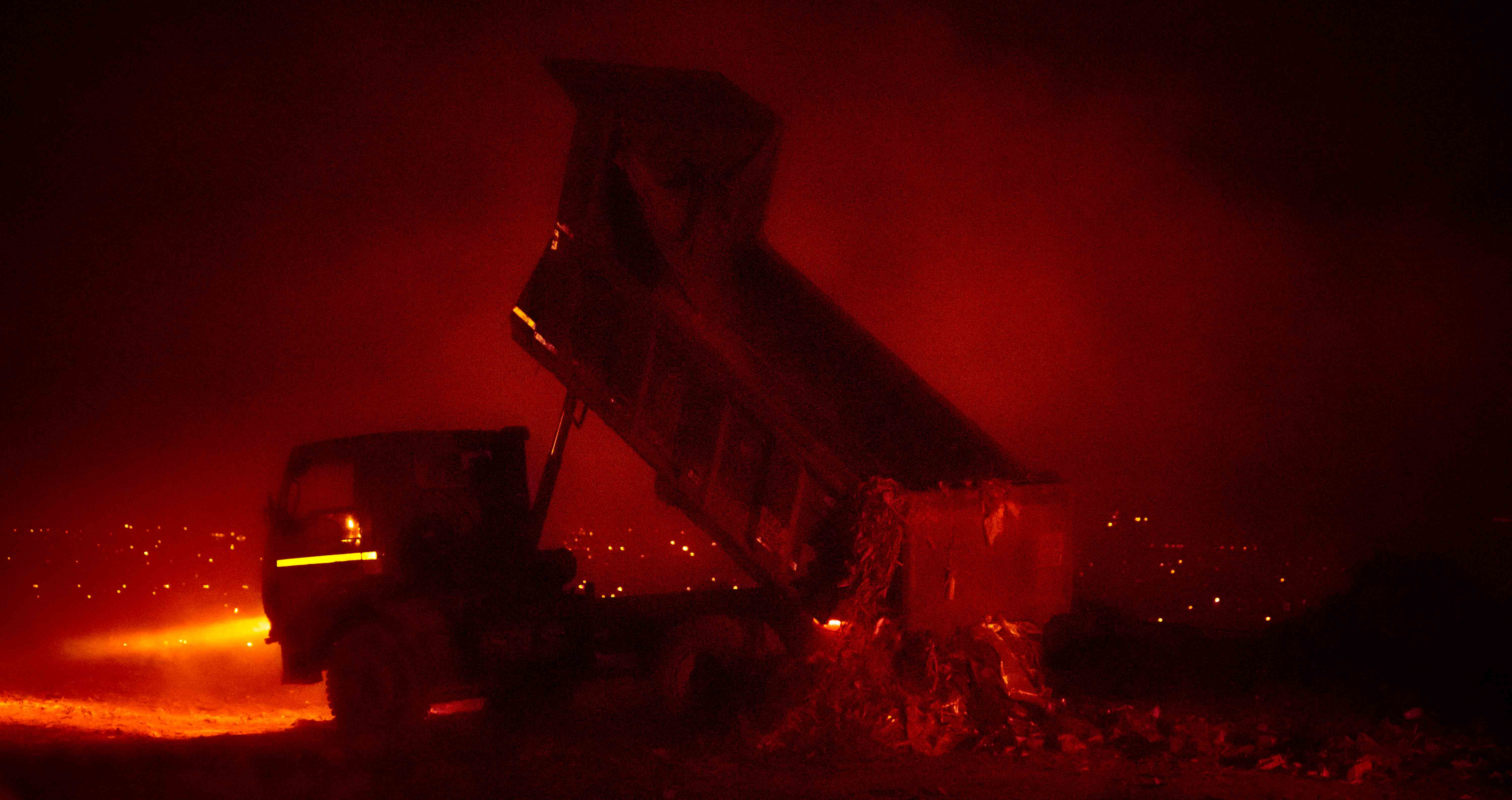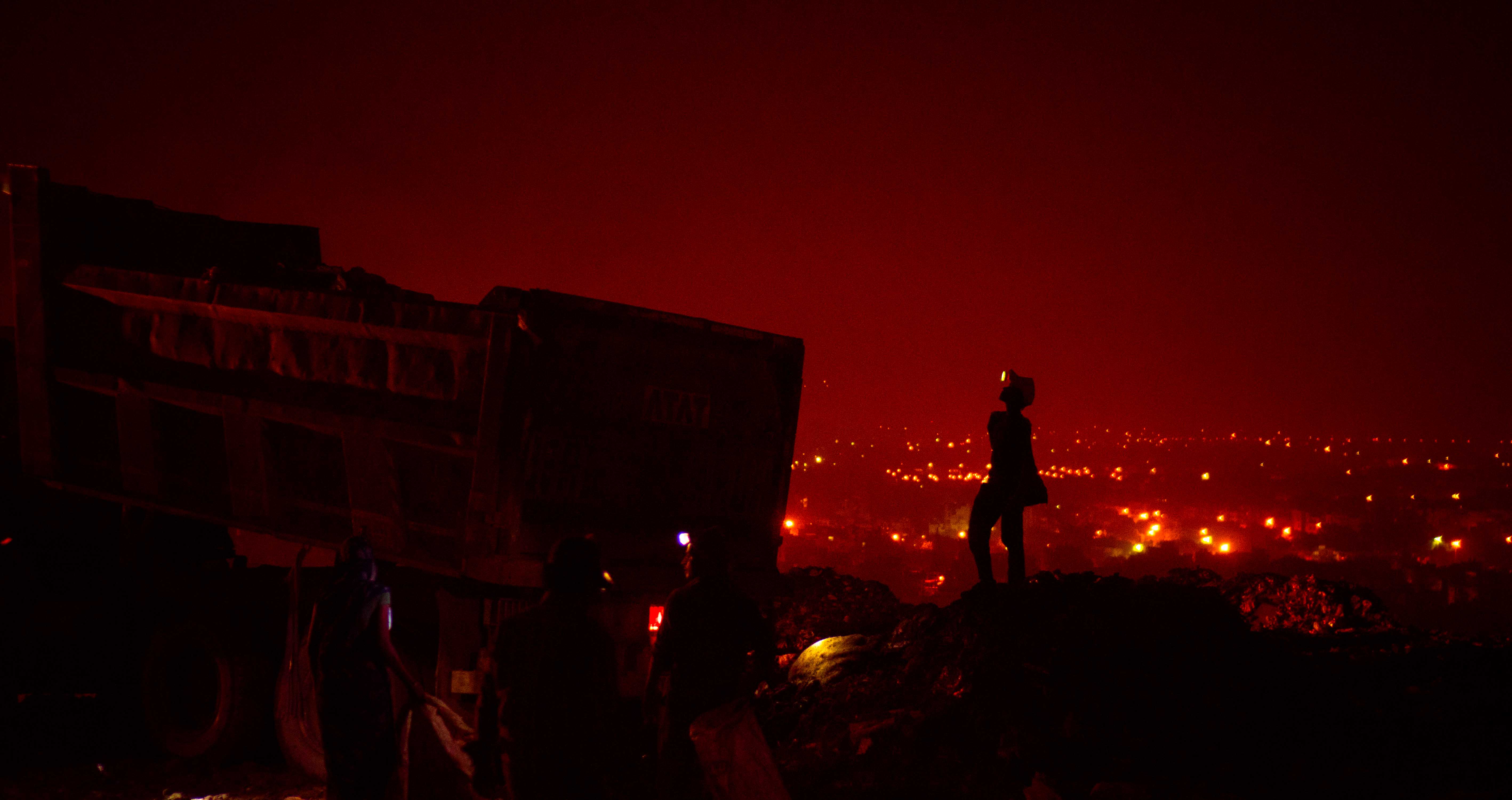 Beneath a crescent moon, a hill of waste rises 200 feet above Delhi. This landfill never stops burning. Hazardous gases fuel the fire from below. Day and night, garbage trucks climb to the summit and dump the city's excess. Each load sends dust across the mountain, choking the air.